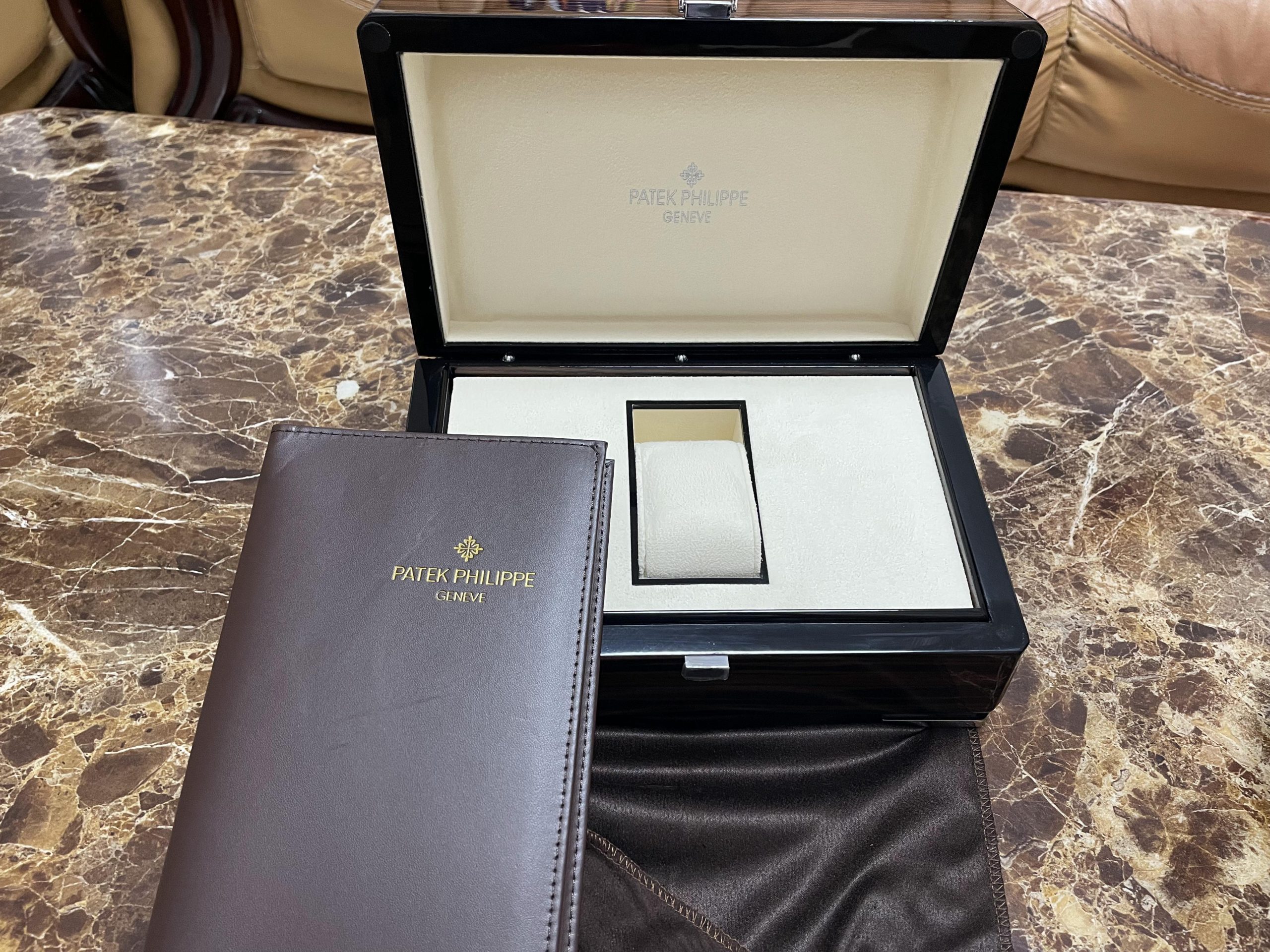 Original Design 1:1 with Dark Colored Decorative Card Paper Outer Box, Inner Mahogany Wooden Box with High Gloss Lacquer Finish with Patek Insignia